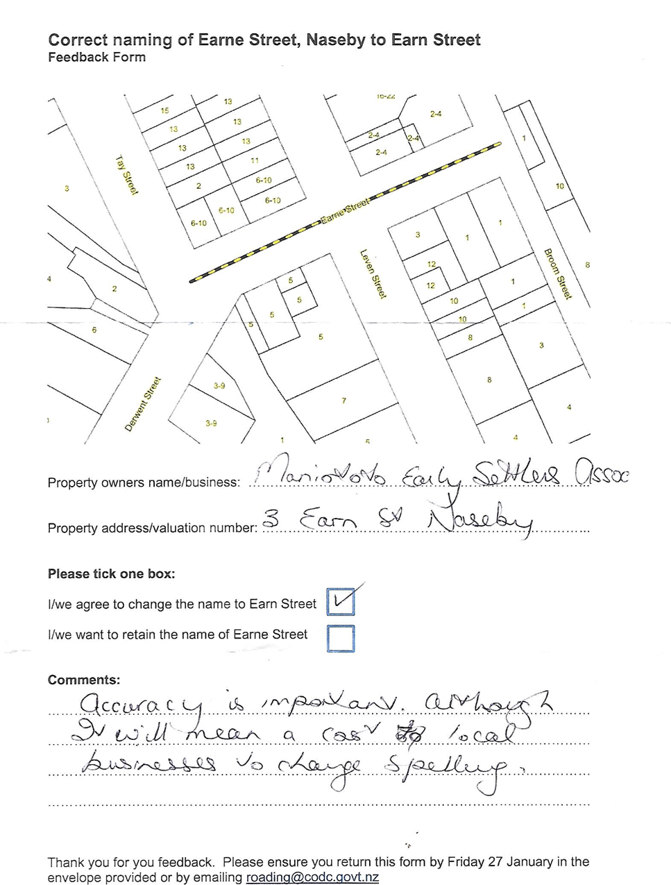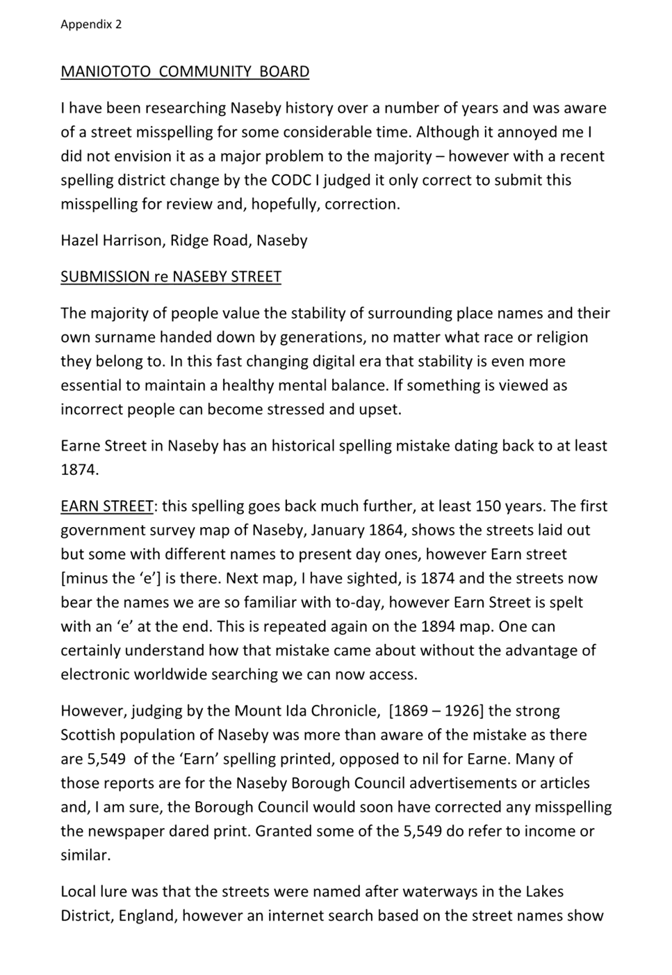 Hazel has been the Maniototo Early Settlers Association researcher for the past ten years and has published seven books about early Mount Ida district. Hazel has provided a written submission (attached as appendix 2) that suggests Earne Street was originally spelt without an “e” at the end of the name. The request is that the Maniototo Community Board considers renaming this street using original spelling and drop the “e” at the end of the name.