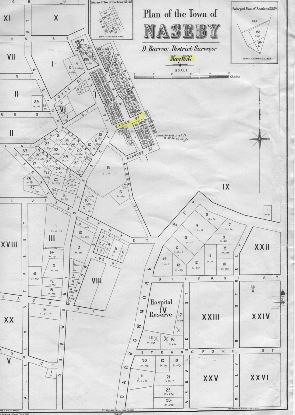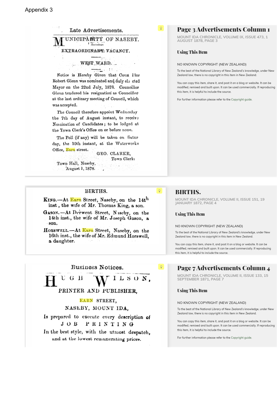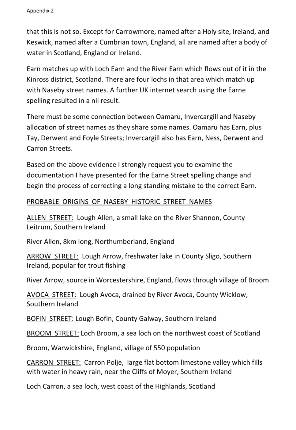 Supporting documents have been provided by way of copies of advertisements in the Mount Ida Chronical and copies two official survey plans of Naseby. Francis Howden, Road Engineer for Otago, January 1864, documents the 'Earn' spelling. David Barron, surveyor, based in Naseby in 1876, documented the ‘Earne' spelling. Hazel strongly suspects that is when and who changed the spelling (refer attachments as appendix 3).