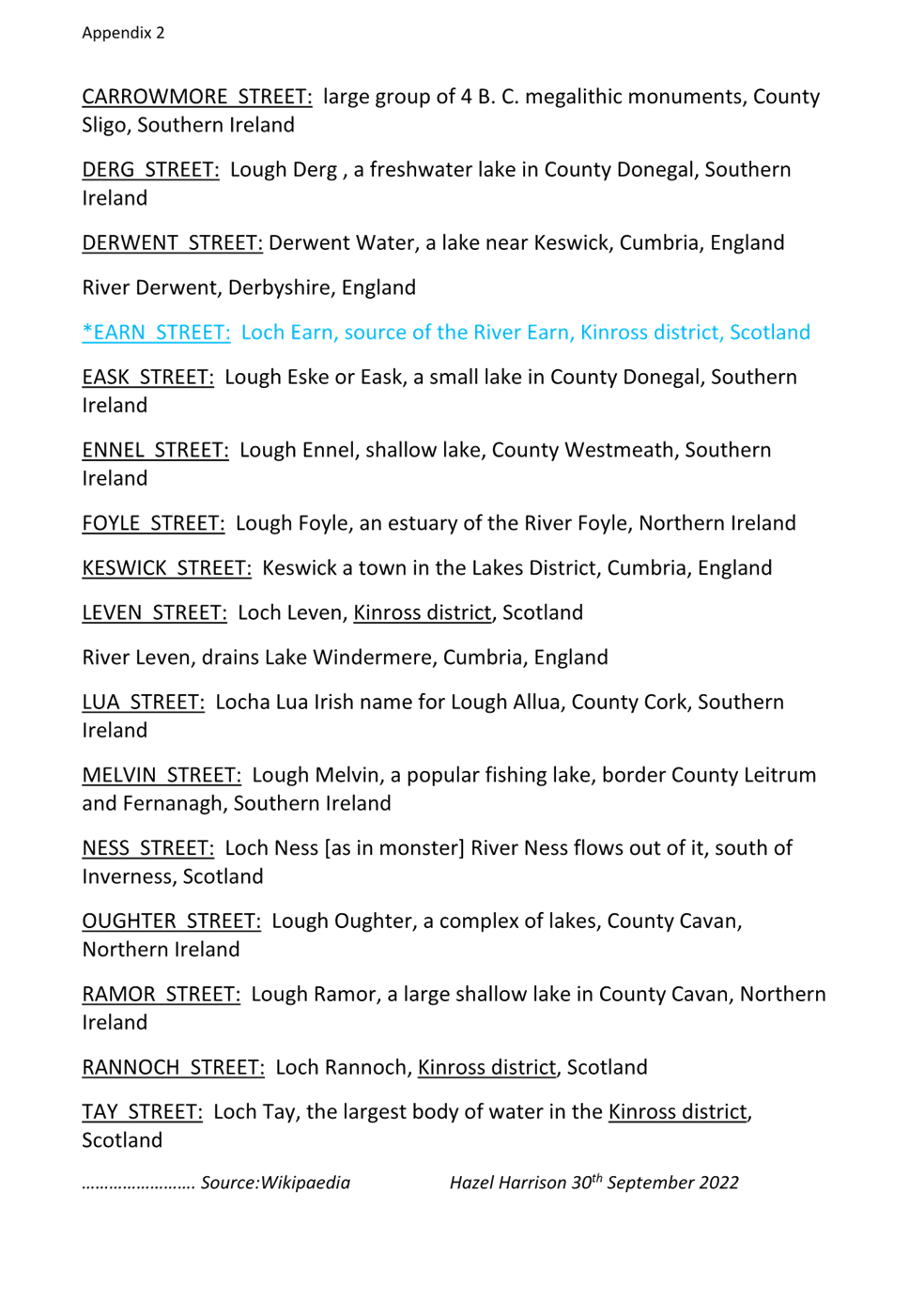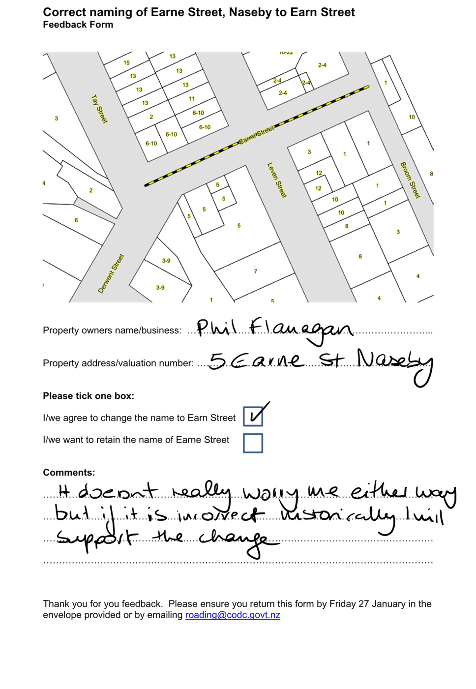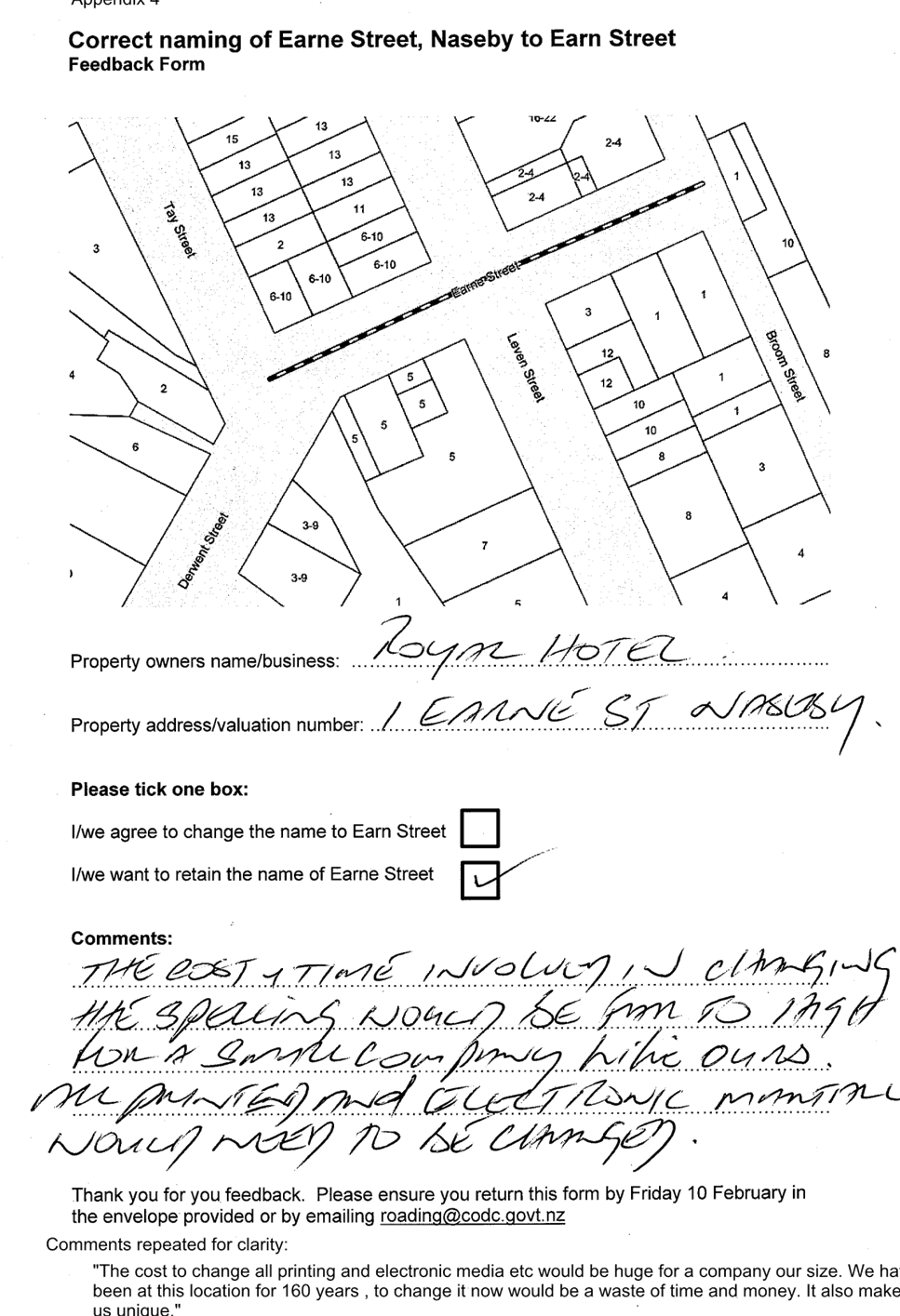One property owner who runs a business on Earne Street is objecting to the change due to costs and time involved in making this change. The business has been in this location for 160 years and the owner does not see the need to change the road name.
