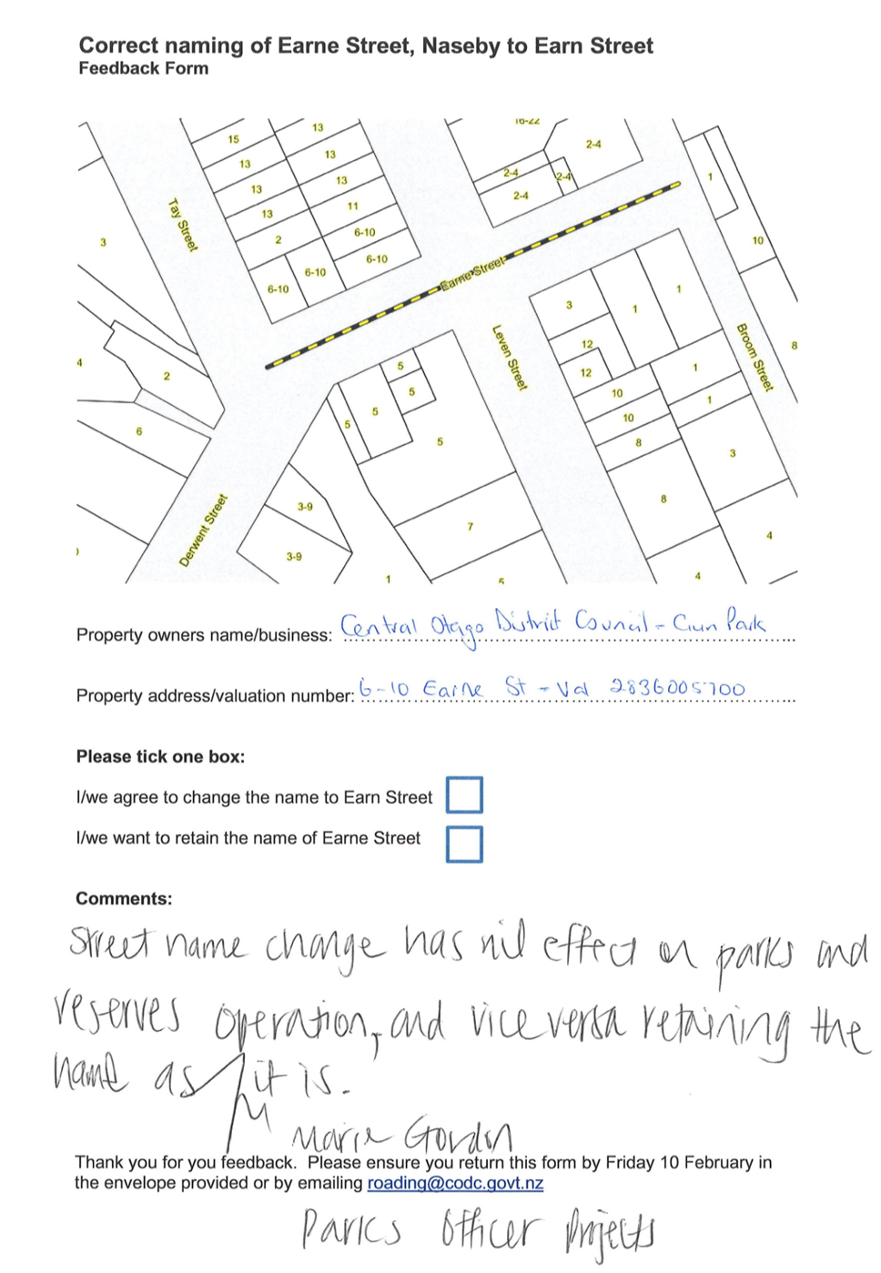 23.4.3 Road Renaming Approval Report - Earne Street, Naseby