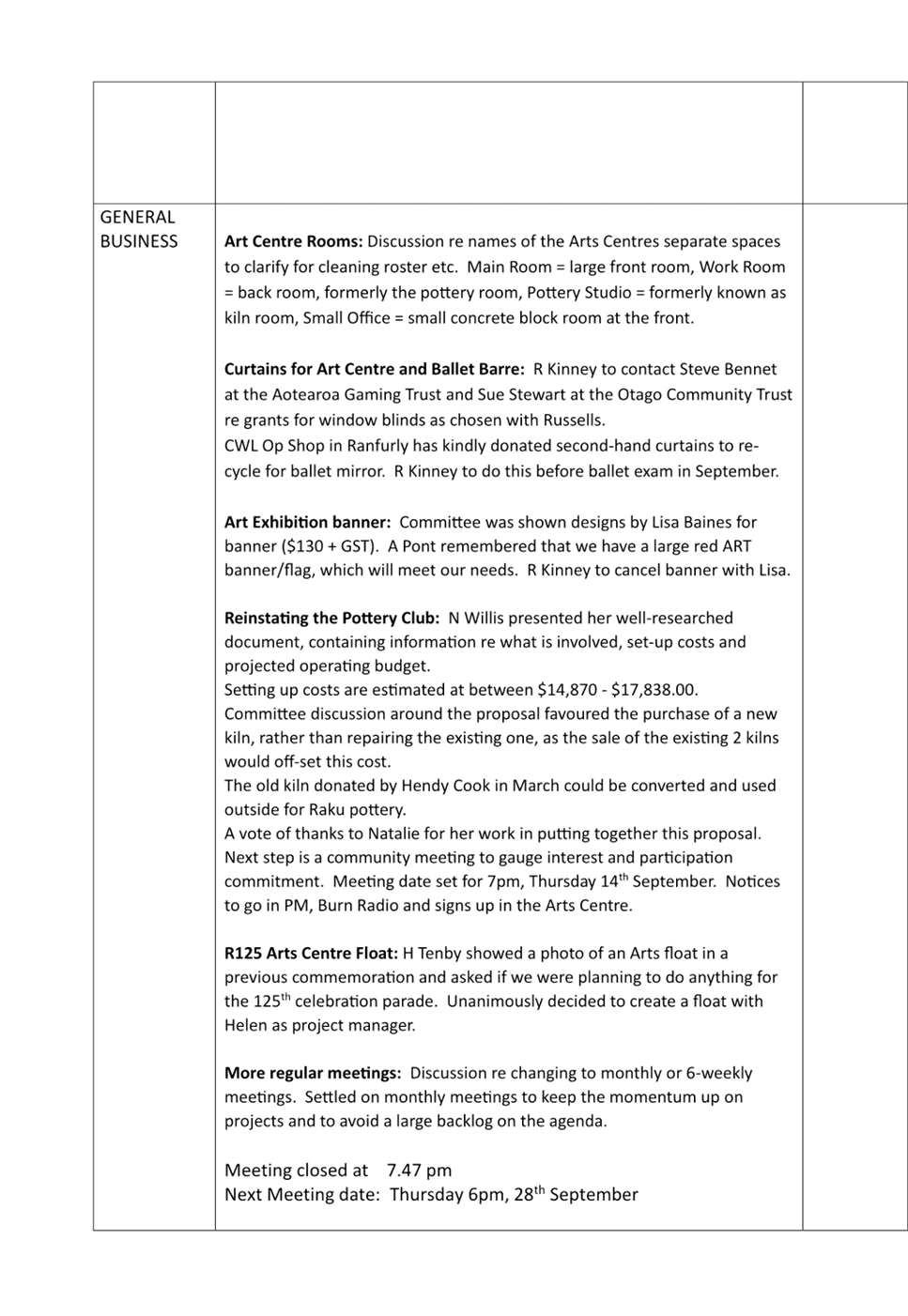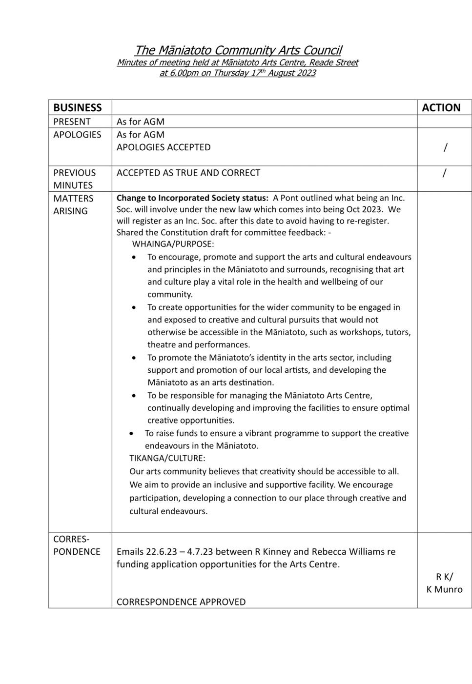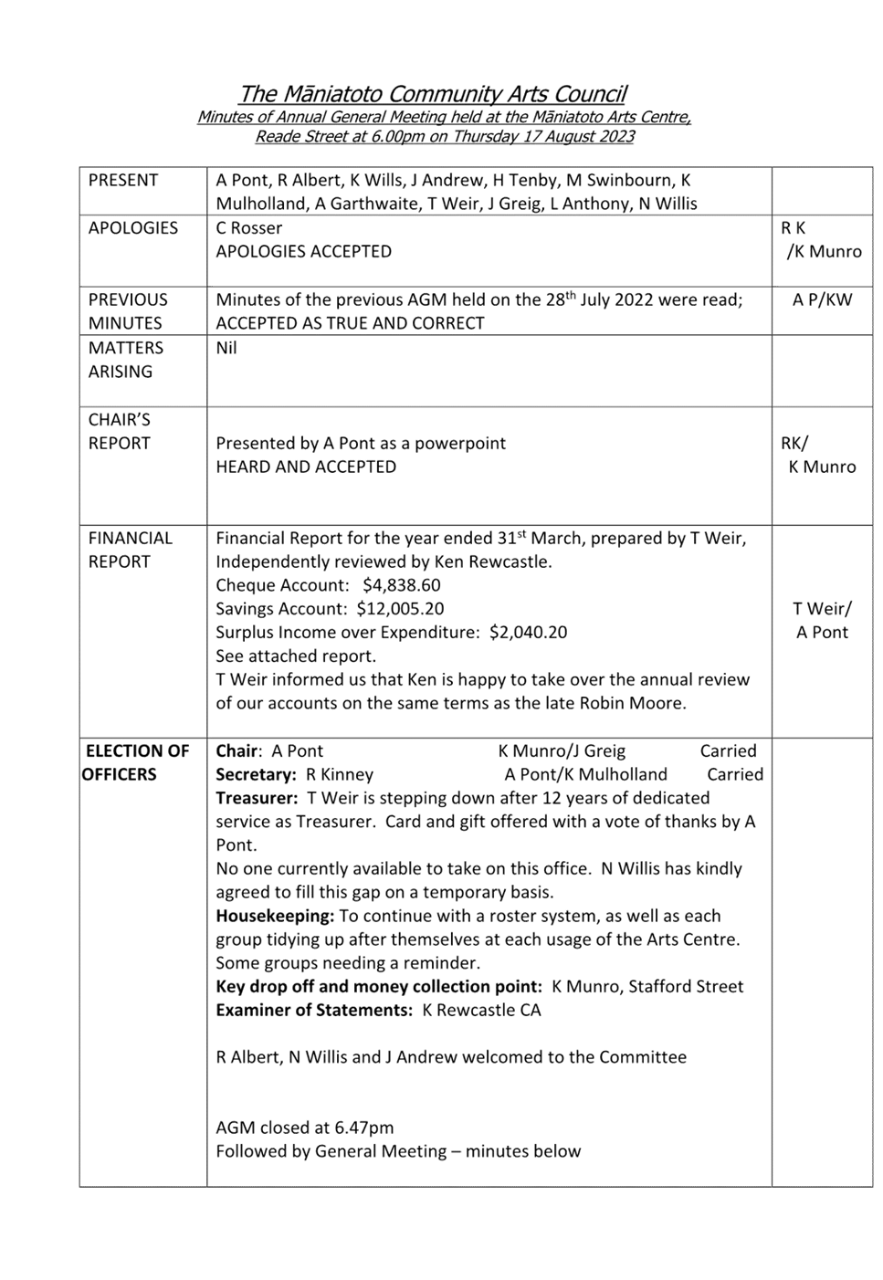 Minutes were received from the Māniatoto Community Arts Council for their 17th August 2023 meeting and AGM.