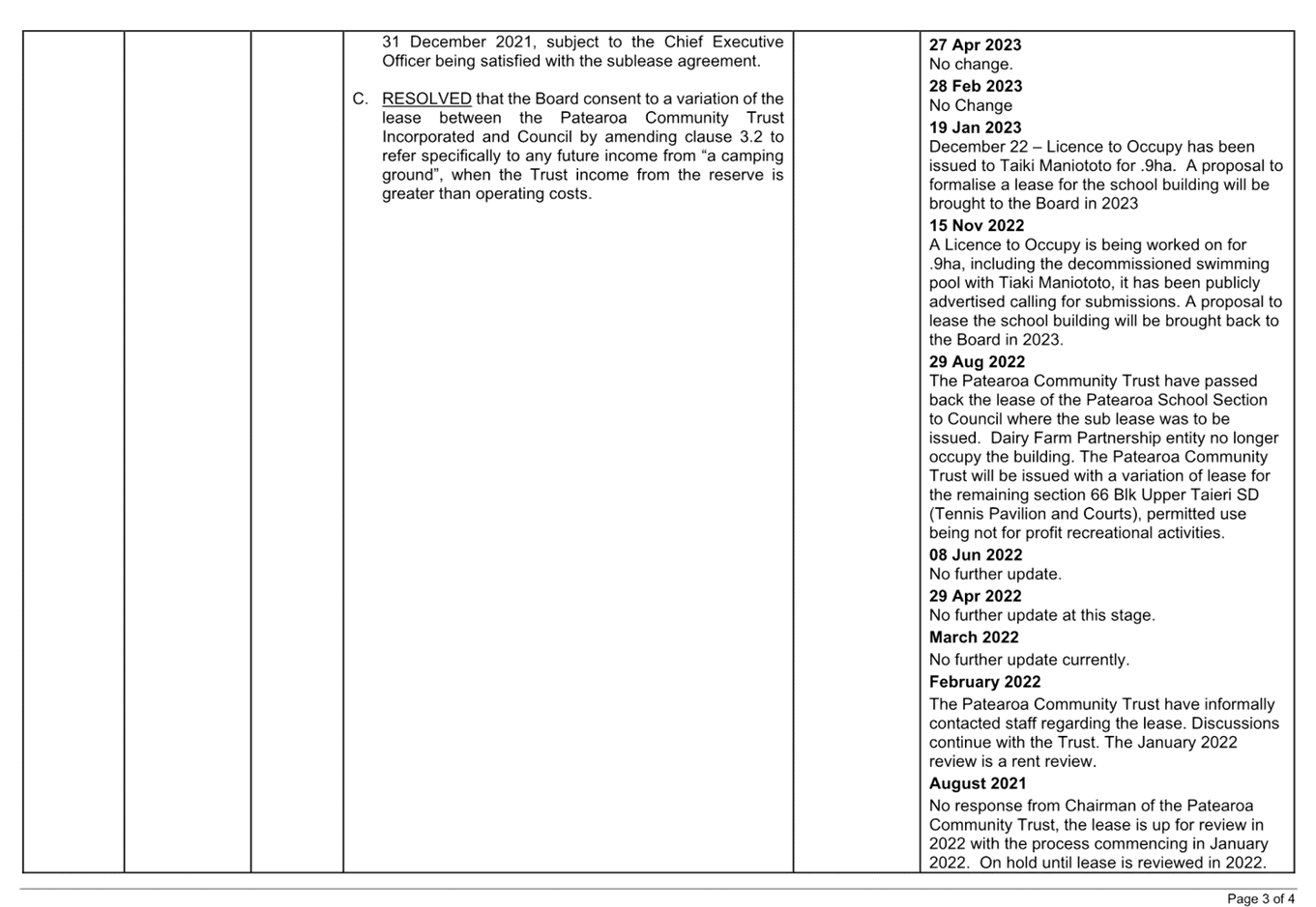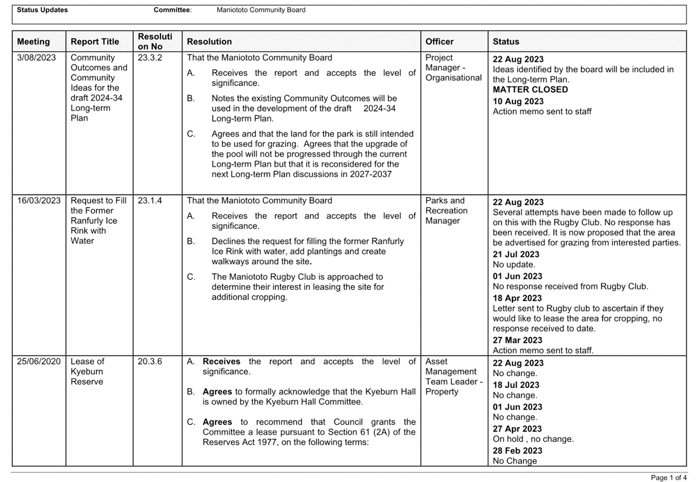 Committee Resolution Moved: McAuley Seconded: Harris That the Maniototo Community Board A. Receives the report and accepts the level of significance. B. Notes the existing Community Outcomes will be used in the development of the draft 2024-34 Long-term Plan. C. Agrees and that the land for the park is still intended to be used for grazing. Agrees that the upgrade of the pool will not be progressed through the current Long-term Plan but that it is reconsidered for the next Long-term Plan discussions in 2027-2037 Carried |