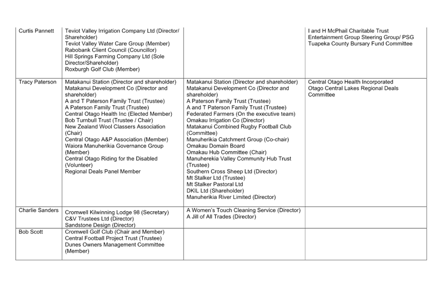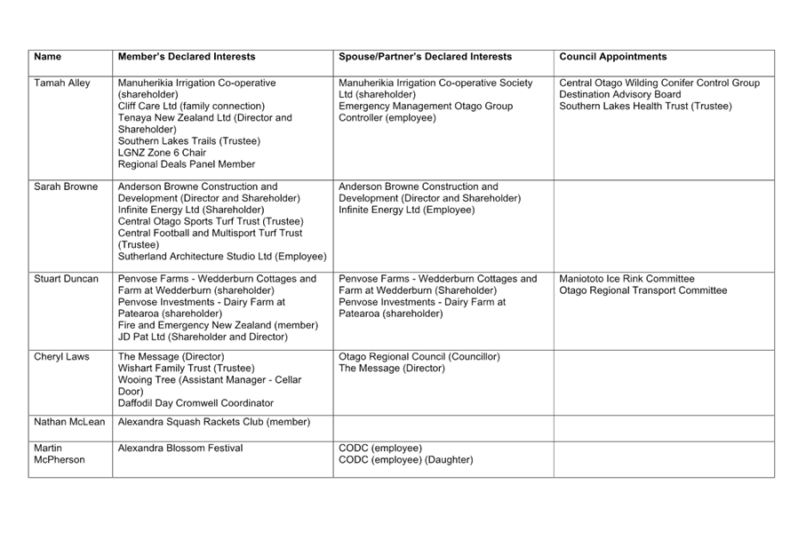 Committee Resolution Moved: Browne Seconded: Sanford That the Cromwell Community Board A. Receives the report and accepts the level of significance. B. Notes the advice given on relevant legislation. C. Adopts the existing Code of Conduct. D. Notes that a new mandatory Code of Conduct will come into effect in December 2025. Carried |